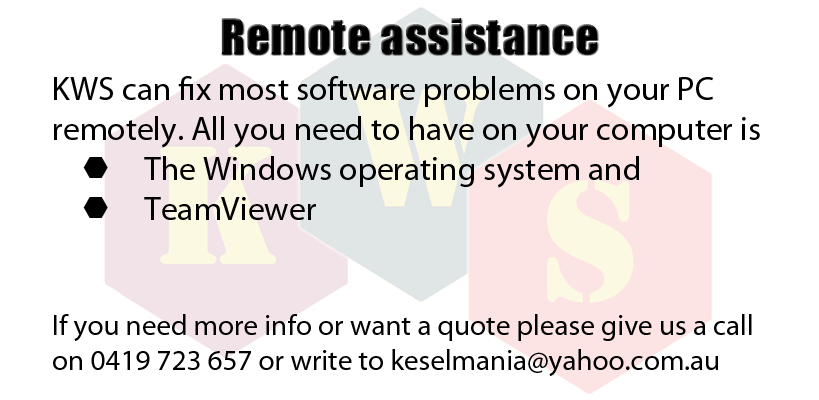 Is your PC misbehaving? Don't stress. Give KWS a call today. We can solve most software problems remotely.